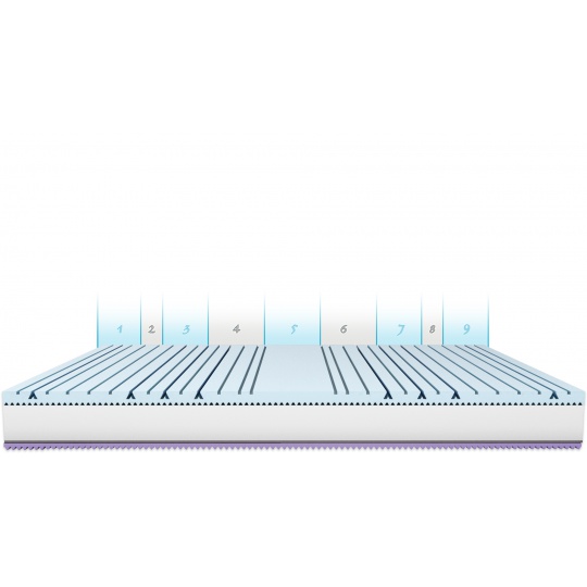 První středně měkká strana je vyrobena z vysoce pružné matracové pěny s unikátním zvlněným střihem, který se kombinaci s 9 zónovými taštíčkovými pružinami tvoří dvojitý zónový systém.