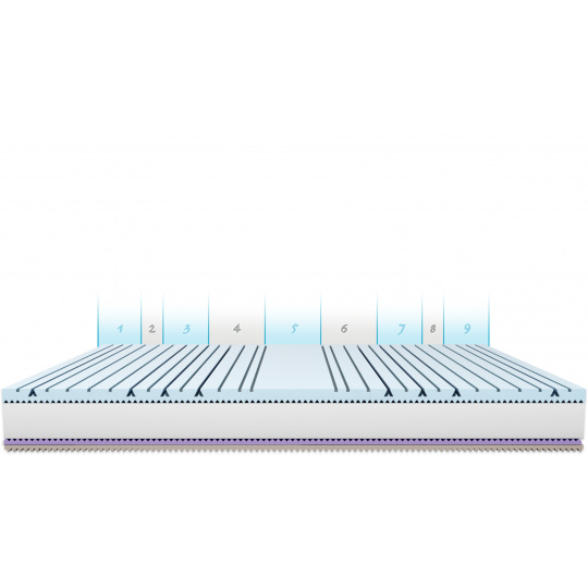 První středně měkká strana je charakterizována kombinací vysoce kvalitní matracové pěny s vlnitým střihem, který v kombinaci s 9 zónovými taštičkovými pružinami tvoří systém dvojího zónování. Mezi pružinami a dalšími vrstvami se nachází proložka, která vytváří formu separace. Matrace Vám zaručí komfortní sen a dobrý odpočinek.